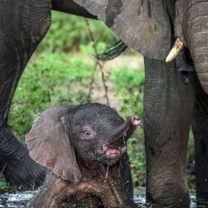 Heartwarming Scene: Mother Elephant Guides Playful Baby to a Refreshing Bath After Muddy Adventure