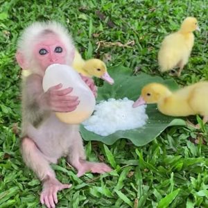 Sweet Baby Monkey Loves Looking After His Own Little Family Of Ducklings
