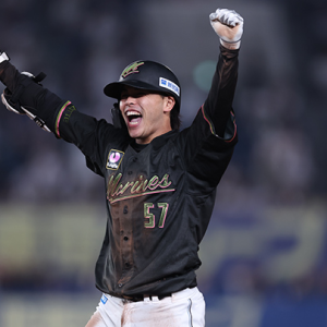 千葉ロッテマリーンズ・小川龍成選手【写真:球団提供】 「2024 スカパー!ドラマティック・サヨナラ賞 年間大賞」が決定し、パ・リーグでは千葉ロッテ・小川龍成選手が受賞した。同賞は、レギュラーシーズンを通じて最もインパクトのあるサヨナラ打などを放った選手に贈られるもの。昨年は7月24日の福岡ソフトバンク戦にて、代打で逆転サヨナラ2ランを打った角中勝也選手が受賞しており、2年連続で千葉ロッテの選手が選出された。 小川選手は7月30日の埼玉西武戦、6対6で迎えた9回裏2死満塁の場面で打席に立つと、相手の守護神・アブレイユ投手の初球を三塁線へ転がす。野手の意表を突いたセーフティバントで内野適時安打をもぎ取り、自身初のサヨナラ打となった。 ・【7/30 結果】2死満塁から小川龍成がサヨナラスクイズ!千葉ロッテは埼玉西武戦12勝0敗に ・佐藤都志也ら7選手が初受賞 2024年度パ・リーグのベストナイン一覧 ・山本大斗が本塁打と打点の2冠 2024年ファームタイトル獲得選手 ・ドラフト1位・西川史礁の加入でさらなる激戦区に。千葉ロッテの熾烈な外野争いに迫る ・M☆Splash!!新メンバーオーディションレポ “人生を変える5分”の使い方