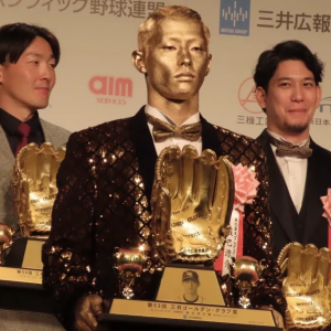 全身ゴールドでゴールデン・グラブ賞の授賞式に出席した楽天・辰己涼介[撮影=ニッポン放送アナウンサー・大泉健斗] 「言ったことは責任持ってやるということが僕の流儀なので」。 『第53回三井ゴールデン・グラブ賞』の表彰式が28日に行われ、パ・リーグ外野手部門で4年連続4回目の受賞を果たした楽天・辰己涼介が、“全身ゴールド姿”で登場した。 辰己は今季、プロ野球新記録となる外野手シーズン最多刺殺397を達成。「今年に関しては刺殺もあったので。飛んで来い来い、というような気持ちで守備にも前のめりにやれていましたので、結果的に更新できて、守備の神様が見てくれていたんだと」と外野守備へのこだわりについて語った。 今季のベストプレーについては「特にはないんですけれども、やはり最後397刺殺をした時に、たまたま雨で。お客さんの人数自体は少なかったんですけど、大歓声をくださった。それが1番嬉しかったです」と振り返った。 (取材=ニッポン放送アナウンサー・大泉健斗)