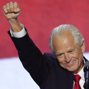 Peter Navarro, former Director of the U.S. Office of Trade & Manufacturing, gestures as he speaks on Day 3 of the Republican National Convention (RNC), at the Fiserv Forum in…