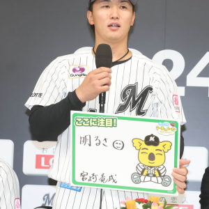 ロッテのドラフト2位・宮崎竜成内野手が4日、吉井理人監督の“指令通り”に明るいキャラ全開で早くも爪痕を残した。新入団選手発表会に出席。自身のアピールポイントに「明るさ」を掲げる23歳は、抱負を語る場面で「将来的には『コアラのマーチ』や『パイの実』のような、たくさんの人に愛される人気のある選手になりたいです」と同社製品とかけて意気込み、場内の笑いを誘った。 会見前には吉井監督から「思う存分にふざけていいぞ~」と言われたといい、“宮崎節”が止まらなかった。ユニホームの着心地を問われると、「感触は『雪見だいふく』のようなとろける感触で、縦縞は初めて着るので体が大きく見えていい」と笑顔。ファンへの一言を求められると、「キシリトールガムのように、さわやかなプレーを見せられるように頑張っていきます」とサラリと答えた。これには同席した玉塚オーナー代行も「早速お気づかいいただき、ありがとうございます。よく考えられたコメントで頼もしく思います」と満面の笑みを浮かべた。 キャラ全開で会見を終えた宮崎は「ひと笑いがほしくて。少し笑いが起きたのでよかった」と、満足げ。本番前の指揮官からの気遣いについては「それで少し緊張がほぐれましたね。ありがたかったです」と、感謝を込めた。173センチと小柄だが、パワフルな打撃が魅力の内野手は「僕もセールスポイントは長打力だと思ってるので、そこはしっかりアピールしていきたい」と、最後はまじめに決意を込めた。