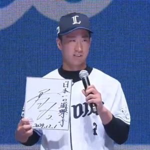 齋藤大翔選手 ⓒパーソル パ・リーグTV 埼玉西武ライオンズは12月1日、「2024ドラフト新入団選手発表会」を開催。新入団選手14名が登壇し、プロ入り後の目標を語った。 齋藤大翔(さいとう・ひろと)/内野手/右投右打 #2/ドラフト1位/金沢高 「目標は日本一の遊撃手です。これから誰よりも練習し、将来は必ず日本を代表するショートになります。そして、ライオンズから必要とされる選手になりたいと思います」 ◇スカウトコメント 「走攻守揃った、特に守備力の高い選手です。将来は内野手のレギュラーになりうる選手だと思います」 渡部聖弥(わたなべ・せいや)/外野手/右投右打 #8/ドラフト2位/大阪商業大 「自分の大きな目標は日本の4番になることで、まず1年目から埼玉西武のリーグ優勝に貢献できるように精一杯頑張ります」 ◇スカウトコメント 「パワーがあり躍動感あふれるプレーが魅力の選手です。チーム愛が強く、将来は軸になってくれることを期待しています」 狩生聖真(かりう・しょうま)/投手/右投右打 #46/ドラフト3位/佐伯鶴城高 「目標は日本のエースです。日本のエースを任せてもらえるように、これから練習に取り組んでいきたいと思います。そしてライオンズのエースにもなれるように頑張りたいと思います」 ◇スカウトコメント 「ストレートの質に魅力があり、将来は先発ローテーションの一角を担えるような投手です」 林冠臣(りん・くぁんちぇん)/外野手/右投右打 #44/ドラフト4位/日本経済大 「目標はホームラン王です。まず来年の開幕スタメンを勝ち取って、ホームランをたくさん打ってチームに貢献できるように頑張りたいと思います」 ◇スカウトコメント 「長打力とスピード感あふれるプレーが魅力で、近いうちに外野手のレギュラー争いに加わる選手だと期待しています」 篠原響(しのはら・ひびき)/投手/右投右打 #52/ドラフト5位/福井工大福井高 「目標は最優秀防御率です。一年でも早く勝てるピッチャーになって、このタイトルを獲ってチームの優勝に貢献できるように頑張ります」 ◇スカウトコメント 「ストレートと多彩な変化球が武器のバランスの良い投手です。先発ローテーションの一角を担うような投手になって欲しいです」 龍山暖(たつやま・はるき)/捕手/右投右打…