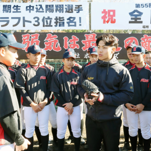 楽天からドラフト3位指名を受けた中込陽翔投手(22)=四国IL徳島=が11月30日、山梨・北杜市で出身チームの北杜ボーイズの体験練習会を訪れた。同市内の長坂グラウンドを訪れるのは1年ぶり。「昨年、ここに来た時は半分野球を辞めるつもりでいたが、いろいろな方々から激励されて徳島でがんばろうと思ったことがプロ入りにつながった」と感慨深げ。 ボーイズ時代は投手と三塁手として活躍。「野球の技術はもちろん、掃除の大切さや遅刻をしないなど野球以外のことを教えていただき人間性を高めることができた」と振り返った。後輩たちは来年春の全国大会への出場を決めた。「整備されたグラウンドで練習できるということは当たり前ではない。そのことに感謝の気持ちを持ち、自分を信じてプレーすれば結果はついてくる」とエールを送った。 最速150キロ右腕は闘志あふれるピッチングが魅力。「開幕1軍が目標。けがをしないように1年間がんばりたい」と意気込む。さらに「気持ちを全面に出した心に残るピッチングができるので、ぜひその姿を見てほしい」とファンにアピールした。