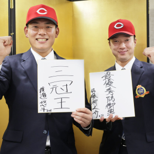 ドラフト会議で広島から2位指名を受けた富士大・佐藤柳之介投手(22)と、4位指名を受けた富士大・渡辺悠斗内野手(22)が29日、岩手・花巻市内のホテルで契約合意した。佐藤は契約金7000万円、年俸1200万円、渡辺は契約金4000万円、年俸800万円(金額は推定)。背番号は佐藤が「28」、渡辺が「49」に決まった。佐藤は今年まで28番をつけた床田寛樹投手(29)のような活躍をすると意欲。渡辺は大学の先輩であるソフトバンク・山川穂高内野手(33)のような強打者に成長すると誓った。 **** 背番号に見合う投手になると、富士大・佐藤が言葉に力を込めた。23、24年と2年連続2ケタ勝利を挙げた左腕エース・床田が着けていた28番を与えられ、「いい番号だ、とビックリしました」。床田についても「学ぶところはたくさんある。投球術であったりトレーニングであったり、できるなら一緒にキャッチボールをさせてもらいたいし、ピッチングを(捕手の)後ろで見てみたい」と、偉大な先輩左腕からどんなことでも吸収していくと前向きに語った。 佐藤に対し、先発として頑張ってほしいと言葉をかけたという広島・近藤芳久スカウトは、「床田みたいな勝てる投手になってほしい」と期待を寄せた。最速148キロのキレのある直球と多彩な変化球のコンビネーションが武器の佐藤も、「一日でも早く1軍の舞台で、先発で投げられるように頑張りたい」と気合十分。まだ背番号28は床田の印象が強いが、「ゆくゆくは、28番といえば佐藤柳之介と言ってもらえるようになればいい」と“床田超え”にも意欲を見せた。大学時から意識する“勝てる投手”をプロでも実践し、背番号28をさらに輝かせる。(有吉 広紀) ◆佐藤 柳之介(さとう・りゅうのすけ)2002年11月1日、宮城県生まれ。22歳。向洋中では七ヶ浜シニアでプレー。東陵から富士大に進み、1年春にリーグ戦デビュー。全国大会は1―3年春の全日本大学選手権、3、4年秋の明治神宮大会に登板。179センチ、86キロ。左投左打。 大学の先輩である右打ちの強打者を目指し、プロでも勝負強い打撃をみせる。「打撃を期待されているので、バットで活躍していければいい」と、富士大・渡辺が意気込みを語った。恵まれた体格を生かした長打力が最大の武器。富士大出身で同じタイプの打者といえば、現ソフトバンク・山川が有名だ。渡辺自身も「山川さんが出ているんだ、と気になって(富士大を)調べたこともある」と明かし、「長打力もあるしタイトルを取っているし、あのくらいのレベルの打者になりたい」と目標に掲げた。 プロに向けて「勝負強い打撃が持ち味なので打点を一番意識したい。打点が増えれば本塁打も打率も自然とよくなると思う」と話し、「(勝負強い打撃が)山川さんみたい、と言われるくらいに打ちたい」と意欲を見せた。力強い振りでマツダスタジアムを何度も沸かせてみせる。 ◆渡辺 悠斗(わたなべ・ゆうと)2002年7月7日、東京都生まれ。22歳。福生一中では福生リトルシニアでプレー。堀越から富士大に進む。リーグ戦通算9本塁打。全国大会は2、3年春の全日本大学選手権、3、4年秋の明治神宮大会に出場。182センチ、98キロ。右投右打。