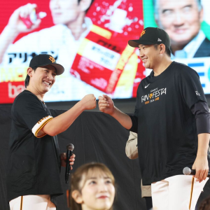 菅野智之投手、小林誠司捕手が30日、裏ファンフェスタの企画、「祝・最優秀バッテリー!『スガコバ』トーク」に登場した。 来季はメジャーに挑戦する菅野は、リーグ優勝後のビールかけでメジャー挑戦への思いを小林に明かしたと言い「ビールかけ終わってインタビューの控え室で急に言いました。誠司は何回も『ウソやろ?』と確認きましたね」と語った。 スガコババッテリーとして今季はバッテリー賞も受賞。菅野は「1番うれしいですよ。2人で1つの賞なので。僕らは発表の前に知らされるんですけどロッカーで2人で『やったね』って話しましたね」と裏話を明かした。 小林は菅野へ「ジャイアンツでいろんなことを教えてもらって、成長させてもらって感謝してますし、その夢を応援しているのでアメリカでは智之らしく自信を持って勝負してほしいと思います」とエール。また菅野はファンへ「本当にこの12年間ファンの方の支えがあってここまで成長させてもらったと思います。寂しい気持ちもありますけどまだまだ頑張る気持ちでいます。今日で(巨人の)ユニホームを着るのはいったん最後にはなりますけど明日からはみんなと同じでジャイアンツファンとして日本一を誰よりも祈っています。心の片隅でいいので僕のことも応援していただけると嬉しいです。本当にありがとうございました」と語った。