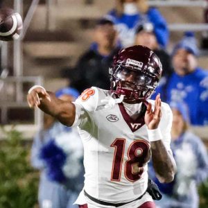 Nov 23, 2024; Durham, North Carolina, USA; Virginia Tech Hokies quarterback William Watson III (18) throws the football during the second half of the game against Duke Blue Devils at…