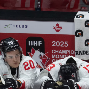 Canada forward Ethan Gauthier (20) sits on the bench alongside teammates Luca Pinelli (13) and Brayden Yager (11) during the third period of the world junior jockey championship quarter-final as…