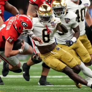Safety Adon Shuler and the Notre Dame defense kept the pressure on Georgia quarterback Gunner Stockton in ND’s 23-10 CFP victory on Thursday. (Photo by Gerald Herbert, Associated Press) Maybe…