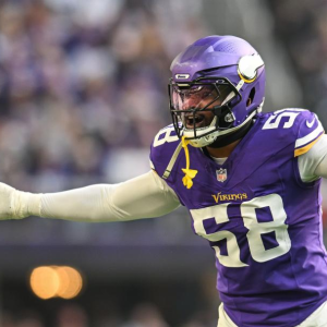 Dec 1, 2024; Minneapolis, Minnesota, USA; Minnesota Vikings linebacker Jonathan Greenard (58) reacts during the second quarter against the Arizona Cardinals at U.S. Bank Stadium. Mandatory Credit: Jeffrey Becker-Imagn Images…