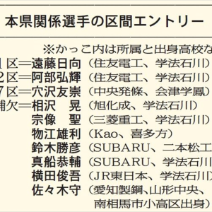トップ 福島のニュース 主要 住友電工 遠藤1区、阿部2区 1月1日、全日本実業団駅伝 2024/12/31 16:32 来年元日の全日本実業団対抗駅伝(群馬県庁発着=7区間、100キロ)の区間エントリーが30日、発表され、2連覇を狙うトヨタ自動車は3区にパリ五輪1万メートル代表の太田智樹を置き、最長区間の2区に鈴木芽吹、5区に西山雄介を配置した。 前回2位で2年ぶりの頂点を目指すホンダは2区にパリ五輪マラソン代表の小山直城がエントリー。2区は同五輪マラソン6位の赤崎暁(九電工)、マラソン日本記録保持者の鈴木健吾(富士通)も名を連ねた。 パリ五輪3000メートル障害8位の三浦龍司(SUBARU)は1区に登録された。 福島県関係では選手10人が【表】の通りエントリーした。 住友電工は学法石川高出身の遠藤日向と阿部弘輝がそれぞれ1区(12・3キロ)と2区(21・9キロ)を走り、たすきをつなぐ。 穴沢友崇(中央発條、会津学鳳高出身)は7区(15・6キロ)に起用された。相沢晃(旭化成、学法石川高出身)ら7人は補欠に回った。 ■展望 新人の能力高いトヨタ ホンダもV争い、混戦か 群馬県庁発着の7区間、100キロに37チームが参加して行われる全日本実業団対抗駅伝は、前回王者のトヨタ自動車や、同2位のホンダが優勝争いの軸となりそうだが、混戦模様だ。 トヨタ自動車は前回優勝メンバーの登録は3人のみだが、1区の吉居大和、2区の鈴木芽吹ら能力の高い新人が加わった。鈴木は11月に1万メートルで日本歴代5位の好記録をマーク。3区に前回2区区間賞の太田智樹、5区には西山雄介が控える。 2年ぶりの優勝を目指すホンダも充実した戦力で、2区の小山直城、3区の伊藤達彦ら、前回出場者が5人走る。前回3位の旭化成も3区の葛西潤ら、実力者を擁する。 GMOインターネットグループは東日本実業団対抗駅伝を初制覇し、勢いに乗る。東日本と同様に、今季絶好調の1区吉田祐也が流れを引き寄せられるか。富士通は2区に鈴木健吾、3区に塩尻和也を配置。マラソンと1万メートルでそれぞれ日本記録を持つ2人の走りで、主導権を握りたい。 21・9キロで最長の2区にはマラソンの有力選手が多数出走。パリ五輪6位の赤崎暁(九電工)、9月に日本歴代2位の記録を出した池田耀平(花王)らによる区間賞争いにも注目だ。