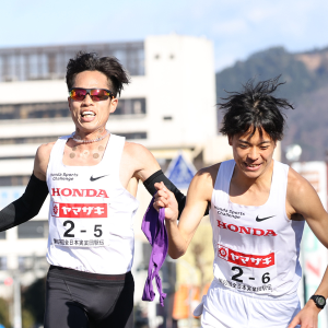 25年ニューイヤー駅伝5区区間賞のHonda・青木涼真 ◇第69回全日本実業団対抗駅伝(ニューイヤー駅伝/1月1日、群馬県庁発着・7区間100km) 【テキスト速報中】2025ニューイヤー駅伝のレース展開をチェック! ニューイヤー駅伝が行われ、5区は2年ぶり王座奪還を狙うHondaが3位からトップに浮上した。 トップとの48秒差を跳ね返したHonda・青木涼真が46分36秒で区間賞を獲得。強い向かい風、アップダウンの多い難所に、入社から5年連続で挑み続けてきた男が、力強くチームを牽引する。 最初の2kmを5分30秒で入ると、前を行く旭化成・大六野秀畝を6.5km、チームの大応援団の前を通過したところでかわす。そして11.3kmでトヨタ自動車・西山雄介を抜いてトップに立つと、旭化成・大六野との一騎打ちに臨んだ。 前に出られる場面もあったが、14.5kmで突き放し、そのまま徐々にリードを広げる。中継所では10秒差をつけ、6区のルーキー・久保田徹にタスキを渡した後は右手人差し指を突き上げた。 前回は2位でタスキを受けたが、区間4位にとどまってトヨタ自動車との差を広げられるかたちに。「自分のところでトヨタに差をつけられて優勝から遠ざかった」と振り返る。その悔しさをぶつけるべく、「今回こそは自分のところで勝負を決めたい」と臨んだ。 その言葉通りの激走に、「4区までがいい位置でつないでくれたことで、自分のところでいくことができた」とチームメイトへの感謝と、「競うことでペースを落とさずにいけた。競う相手がいるのは大事だと思った」と競り合った大六野を称える言葉を続ける。 21年東京五輪から3000m障害で世界に挑み続けてきた青木。東京世界選手権イヤーの幕開けにふさわしい、力強い激走を見せた。 月陸編集部 月刊陸上競技 ******* **************************************************************************** ******* ****************************************************************************