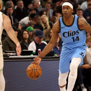 Jan 22, 2025; Inglewood, California, USA; LA Clippers guard Terance Mann (14) dribbles during the first quarter against the Boston Celtics at Intuit Dome. Mandatory Credit: Jason Parkhurst-Imagn Images The…