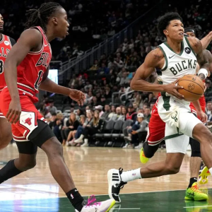 Milwaukee Bucks forward MarJon Beauchamp (3) drives to the basket during the first half of their preseason game against the Chicago Bulls Sunday, October 8, 2023 at Fiserv Forum in…