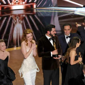 Item 1 of 3 Gints Zilbalodis, Matiss Kaza, Ron Dyens and Gregory Zalcman win the Oscar for Best Animated Feature Film for “Flow”, as they stand near Andrew Garfield and…