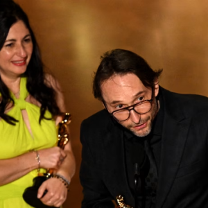 Marilyne Scarselli, Pierre Olivier Persin and Stéphanie Guillon accept the award for best makeup and hairstyling for ‘The Substance.’ (Patrick T. Fallon/AFP/Getty Images) “The Substance” won the Oscar for makeup…
