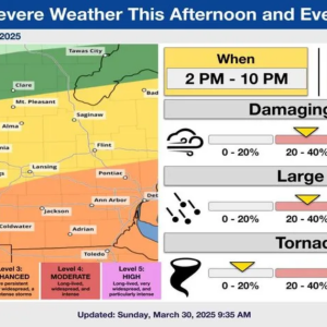 The Lansing region could experience severe storms Sunday, with damaging winds, large hail, and a slight chance of a tornado. The most severe weather is expected south of M-46, with…