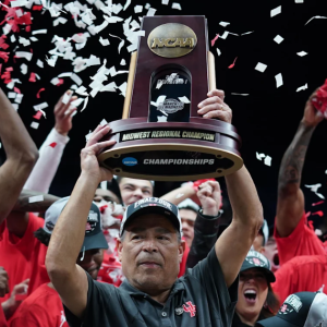 Sampson holds the trophy for winning the Midwest Regional surrounded by Cougars players. / Robert Goddin-Imagn Images INDIANAPOLIS—In Saturday’s media availability before the Houston Cougars faced the Tennessee Volunteers for…