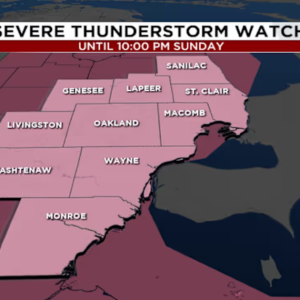 A Severe Thunderstorm Watch has been issued for all of Southeast Michigan until 10 p.m. Sunday. A Severe Thunderstorm Watch has been issued for all of Southeast Michigan until 10…