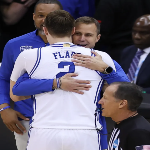 NEWARK, NJ – MARCH 29: Cooper Flagg #2 of the Duke Blue Devils hugs head coach Jon Scheyer after … More winning the Elite 8 round of the NCAA Men’s…