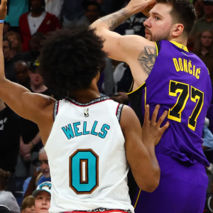 Item 1 of 43 Mar 29, 2025; Memphis, Tennessee, USA; Los Angeles Lakers guard Luka Doncic (77) handle the ball as Memphis Grizzlies forward Jaylen Wells (0) defends during the…