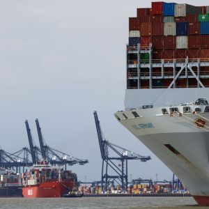 The MSC Regulus container ship, operated by Mediterranean Shipping Co. (MSC), left, the Monte Verde container ship, operated by Hamburg Sud, centre, and the OOCL Germany container ship, operated by…