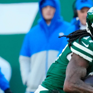 New York Jets wide receiver Allen Lazard (10) takes care of Los Angeles Rams cornerback Ahkello Witherspoon (4) as New York Jets wide receiver Davante Adams (17) continues with the…