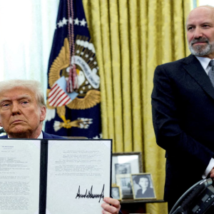 President Donald Trump holds an executive order about tariffs increase, flanked by U.S. Commerce Secretary Howard Lutnick, in the Oval Office of the White House in Washington, D.C., U.S., February…