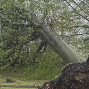 (Photo: KDKA) Strong winds uprooted a tree in Oakmont on April 29, 2025. Credit: KDKA Winds ripped off part of a roof and left it sitting at an intersection on…