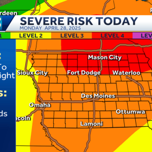A severe weather outbreak remains possible Monday across much of Iowa.Here’s what to know:Northern Iowa has a Level 4 of 5 risk for severe stormsSevere weather is possible from roughly…