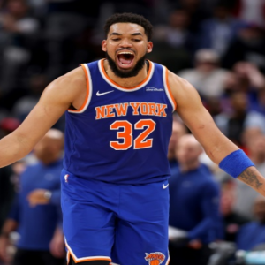 Karl-Anthony Towns of the New York Knicks reacts after a three point basket in the Knicks’ victory over the Detroit Pistons in game four of their NBA playoff series (Gregory…
