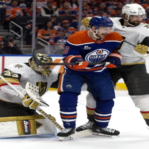 The Edmonton Oilers’ Zach Hyman (18) battles the Vegas Golden Knights’ Nicolas Hague (14) and goalie Adin Hill (33) during first period NHL playoff action at Rogers Place, in Edmonton…