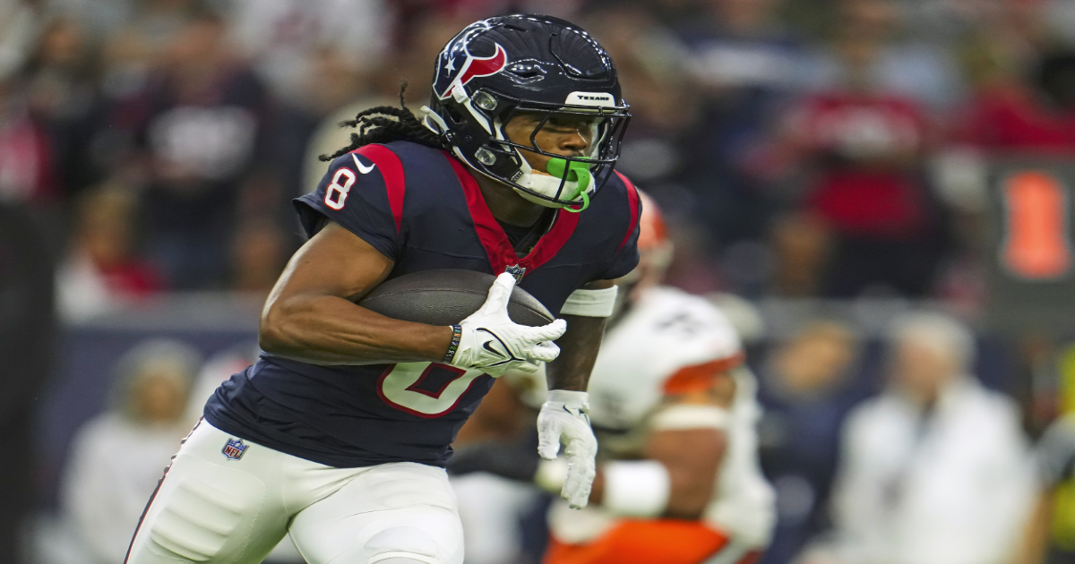 John Metchie III #8 of the Houston Texans runs the ball during an NFL wild-card playoff football game against the Cleveland Browns at NRG Stadium on January 13, 2024 in Houston, Texas. John Metchie III #8 of the Houston Texans runs the ball during an NFL wild-card playoff football game against the Cleveland Browns at NRG Stadium on January 13, 2024 in Houston, Texas. Cooper Neill/Getty Images