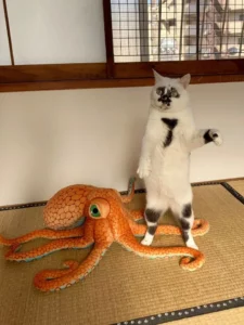 In a quirky and endearing scene, my curious cat has taken it upon himself to engage in a playful interaction with an unlikely companion—the octopus. With an air of determination,…