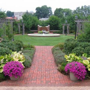 Agregue profundidad a los escalones con esta pared de ladrillos formal. El círculo de ladrillos en la parte inferior muestra un toque de artesanía. La cascada de flores plantada en el…