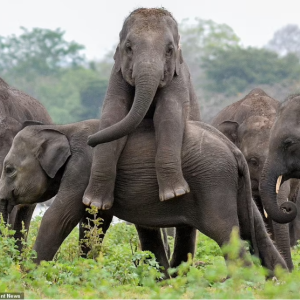 En estas encantadoras fotografías tomadas en Sri Lanka, un joven y enérgico elefante trepa juguetonamente a la espalda de su compañero más grande para dar un paseo a cuestas. #1…