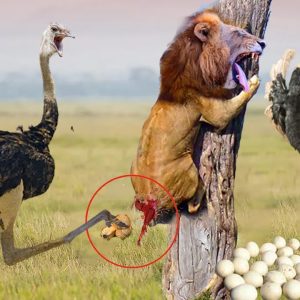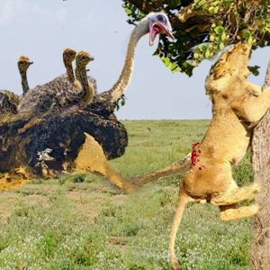 Llevando a su cría en la espalda, la madre avestruz golpeó ferozmente al león usando sus largas piernas contra un gran árbol.