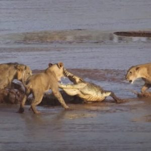 Tres leonas se abalanzan sobre un cocodrilo en una vista inusual después de que el reptil intentara atacar a uno de los cachorros de la manada. Las hembras protectoras se…