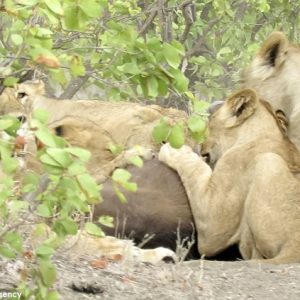 Los leones se involucran en la caza de cachorros, lo que provocó que las madres búfalos tomaran represalias atacando a un grupo de 14 leones para proteger a sus crías.