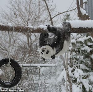 El panda gigante disfruta columpiándose en la nieve sin preocuparse por nadie.