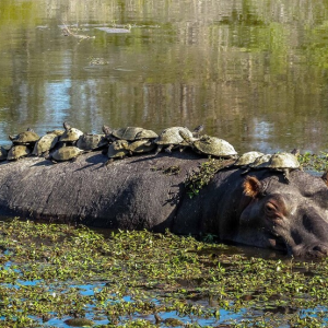 Impresionante imagen de más de 30 tortugas trepando por la espalda del hipopótamo mientras se sumerge en el río. – nature