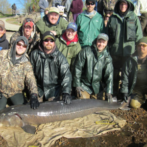 Equipo de pesca del DNR marcando el esturión que batió récords en la presa de Shawano. Luego se soltó el pez para permitirle terminar su ciclo de desove. Crédito de la imagen:…