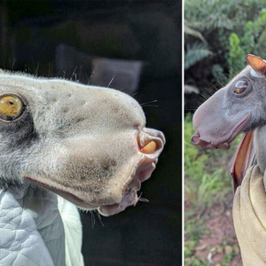 Apparence terrifiante d’un mammifère volant rare avec une tête de chiot dans une grotte