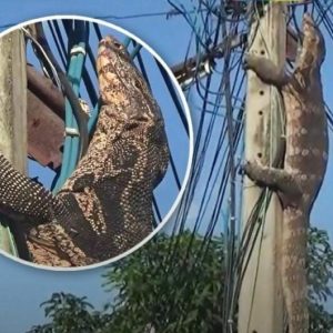 “A giant lizard climbs a power pole to escape from a pack of dogs chasing it. This incredible sight was captured on camera and has gone viral on social media….