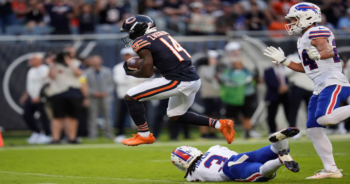 Chicago Bears wide receiver Olamide Zaccheaus (14) leaps past Buffalo Bills’ Damar Hamlin (3) and Cole Bishop (24) on his way to the end zone for a touchdown after catching a pass in the first half of a preseason NFL football game Sunday, Aug. 17, 2025, in Chicago. (AP Photo/Erin Hooley)