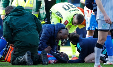 Jean-Philippe Mateta was carried off on a stretcher and taken to hospital after the challenge by Liam Roberts. Photograph: Tom Jenkins/The Observer
