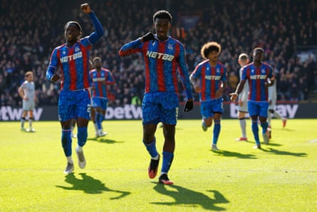 Eddie Nketiah sealed the win with a header for the third Crystal Palace goal. Photograph: Tom Jenkins/The Observer