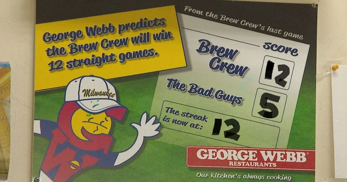 That’s because on Wednesday, the Brew Crew captured their 12th straight victory with a 12-5 win over the Pittsburgh Pirates — fulfilling George Webb’s prophecy and triggering his namesake restaurant to give away burgers.
