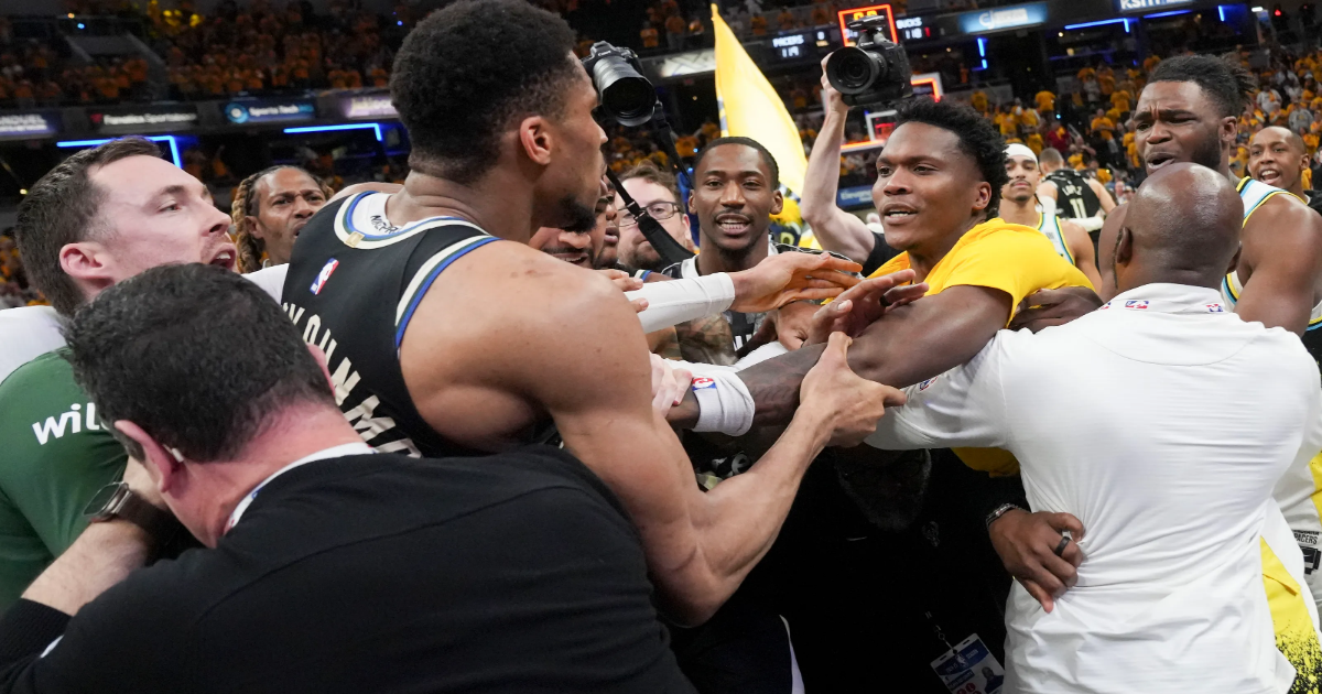 Milwaukee Bucks star player Giannis Antetokounmpo had to be separated twice after the Indiana Pacers won in overtime in Game 5 on April 29.