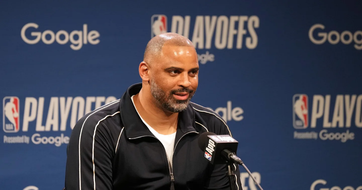 Apr 26, 2025; San Francisco, California, USA; Houston Rockets head coach Ime Udoka talks with media members before game three of first round for the 2024 NBA Playoffs against the Golden State Warriors at Chase Center. Mandatory Credit: Darren Yamashita-Imagn Images / Darren Yamashita-Imagn Images